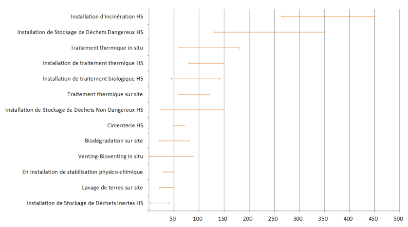Les coûts varient par ailleurs selon que les solutions de gestion des sols pollués sont mises en œuvre 1/ hors site (45-135 €/tonne), 2/ sur site (30-40 €/tonne) ou 3/ in situ (10-30 €/tonne).