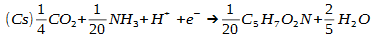 L'équation globale doit tenir compte de la synthèse de biomasse. Avec l'ammonium comme source d'azote et avec une biomasse dont la formule théorique est C5H7O2N, la réaction de synthèse s'écrit :